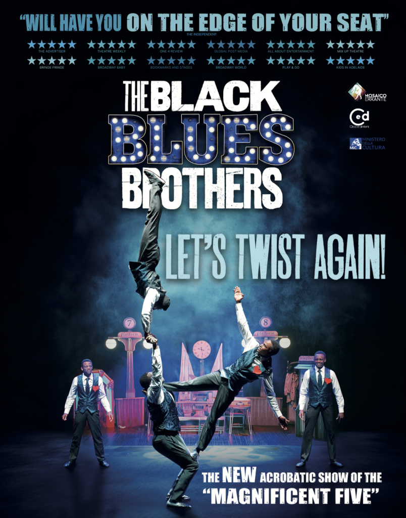 Déjà présenté avec succès dans des théâtres prestigieux et dans les festivals les plus importants, Let’s twist again ! est le deuxième spectacle des Black Blues Brothers, les « cinq magnifiques », comme les a définis le célèbre critique Franco Cordelli les a définis dans le Corriere della Sera. Il s’agit d’un groupe d’acrobates kenyans sensationnels et ovationnés dans de nombreuses salles au cours de leur tournée mondiale avec plus de 900 dates et 600 000 spectateurs.